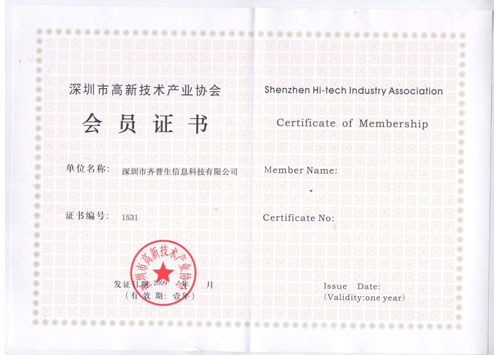 深圳市高新技術(shù)產(chǎn)業(yè)協(xié)會(huì)會(huì)員證書(shū)